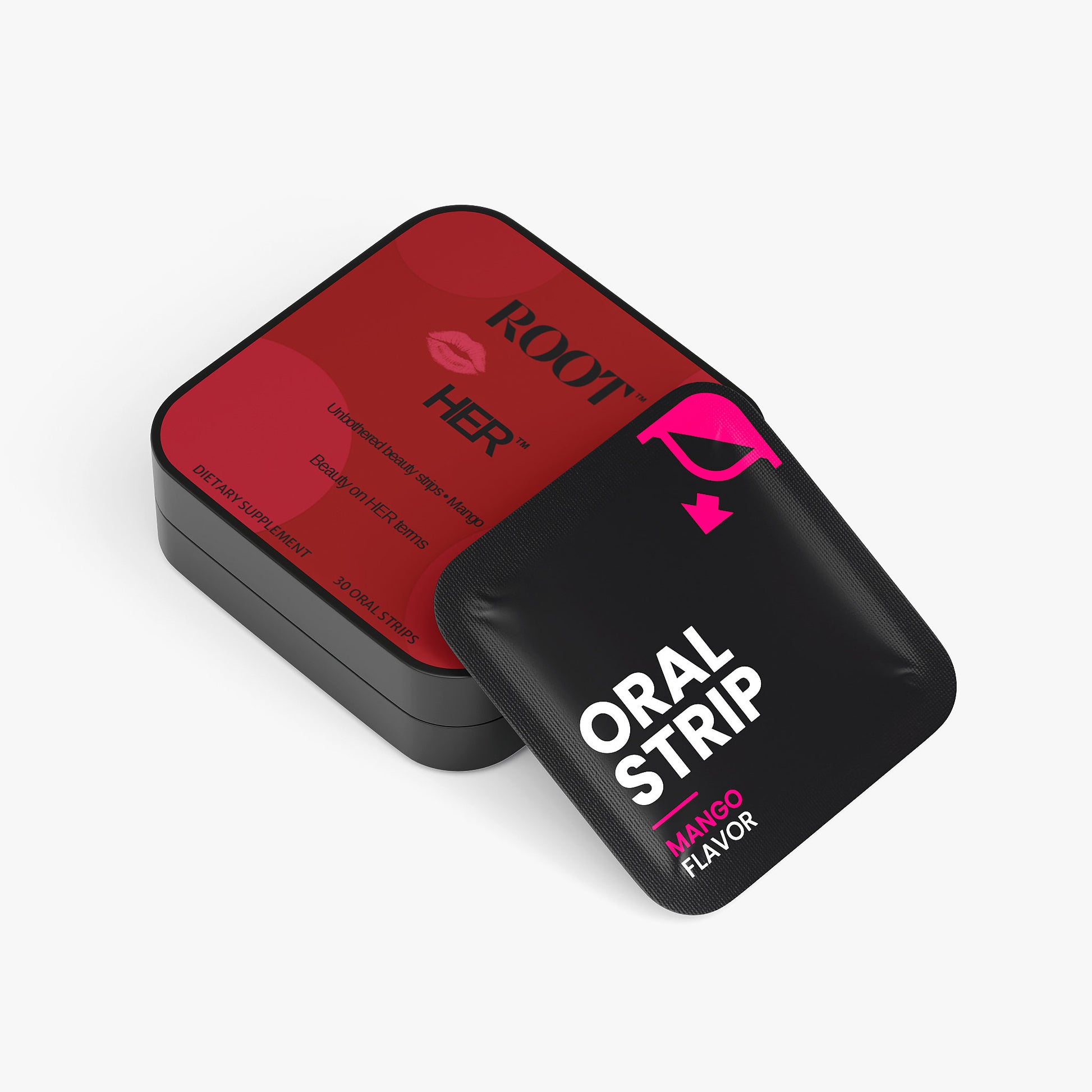 HER is biotin, collagen, and vitamin E in a mango-flavored strip that dissolves on your tongue. No water. No pills. No pretending you're fine when you're becoming something better.