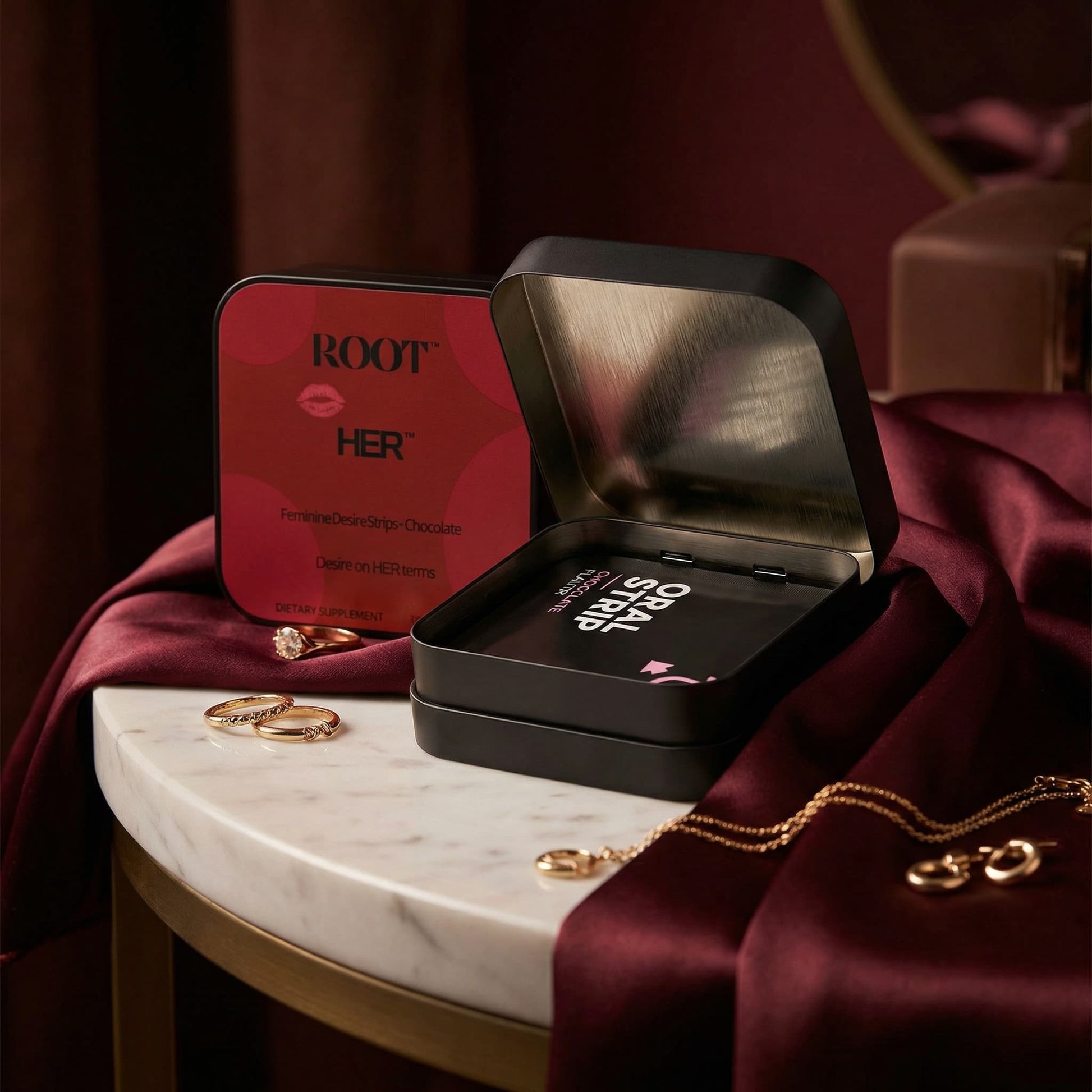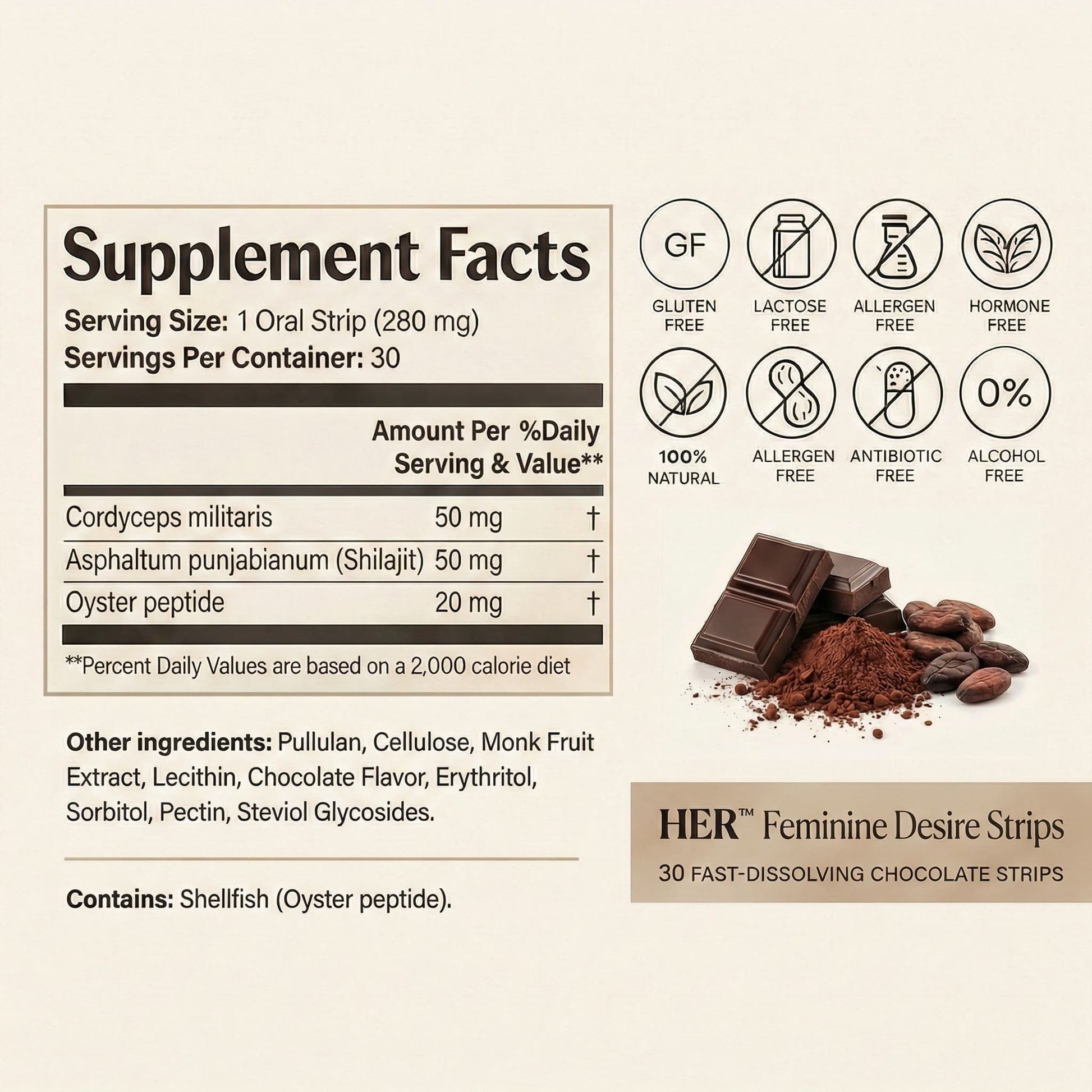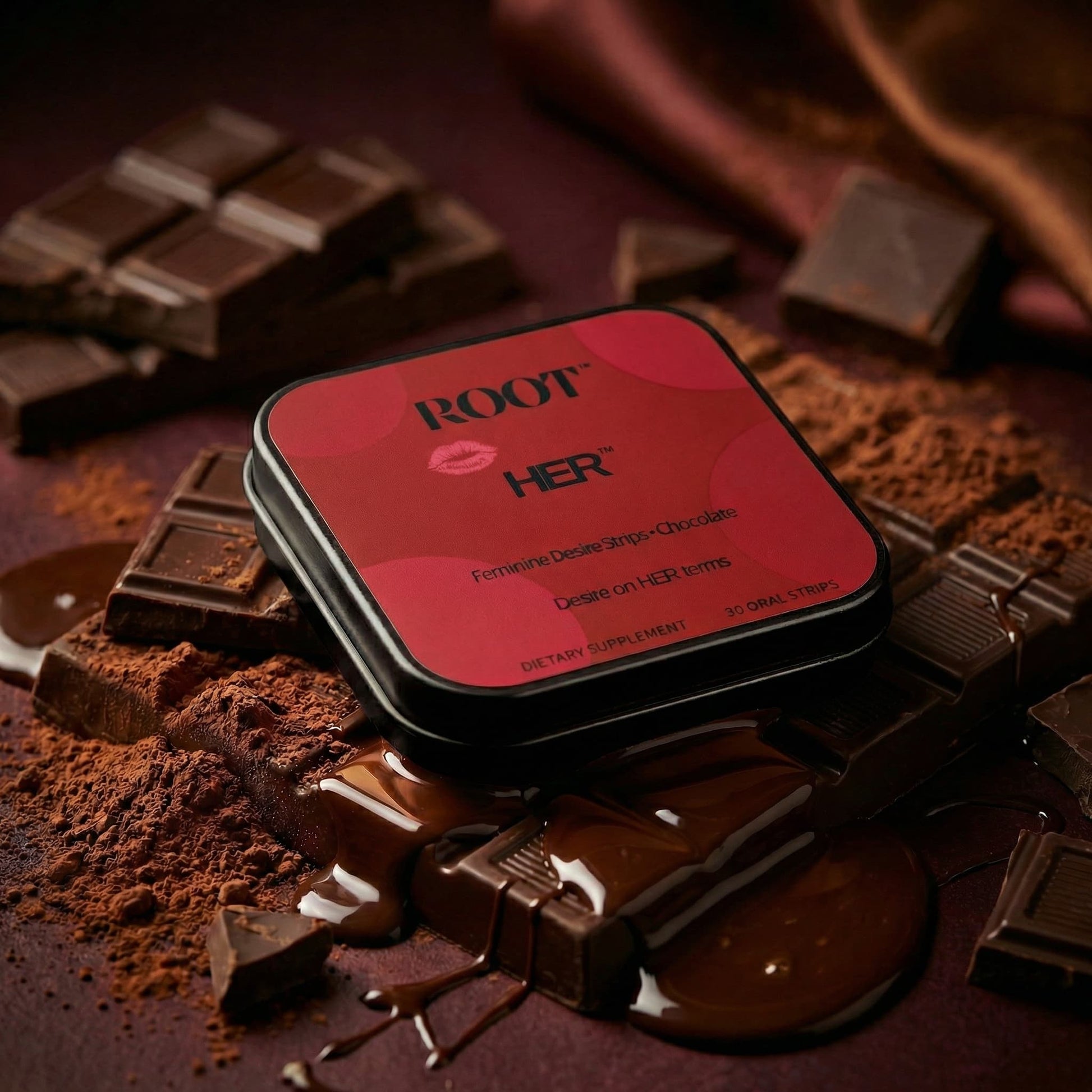 HER™ Feminine Desire Strips are fast-dissolving chocolate oral strips designed to support natural energy, stamina, and sexual wellness, so you can feel present, responsive, and connected again.